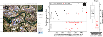 Wuhan and the Hubei province the first region worldwide to experience an official lockdown of industry and public life (from Jan. 23rd 2020 to Apr. 8 2020). To demonstrate how a combination of methods can be used to gain a robust insight into water quality changes even without access to in-situ measurements we picked the Han River which crosses the city of Wuhan (China) and flows into the Yangtze.